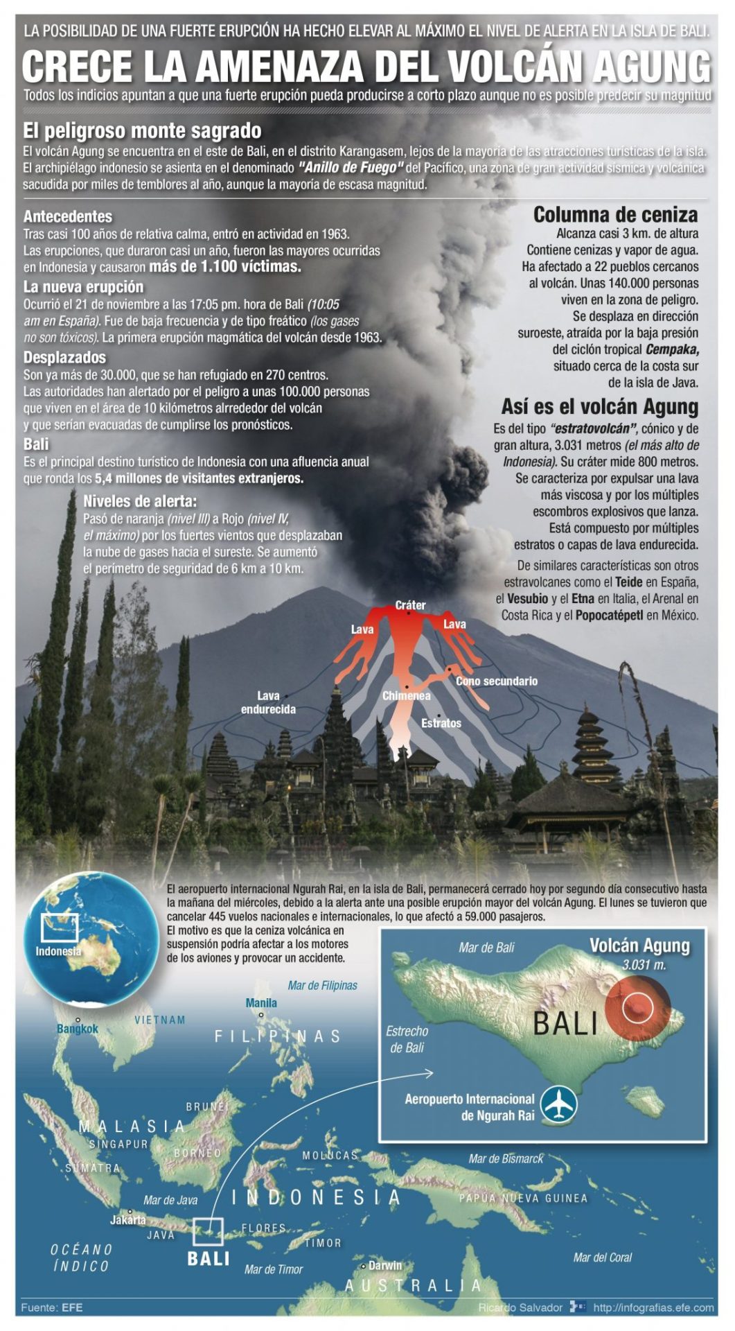 El volcán se levanta en el este de Bali, en el distrito Karangasem, lejos de la mayoría de las atracciones turísticas que permanecen seguras, aunque el BNBP recomienda el uso de mascarillas.