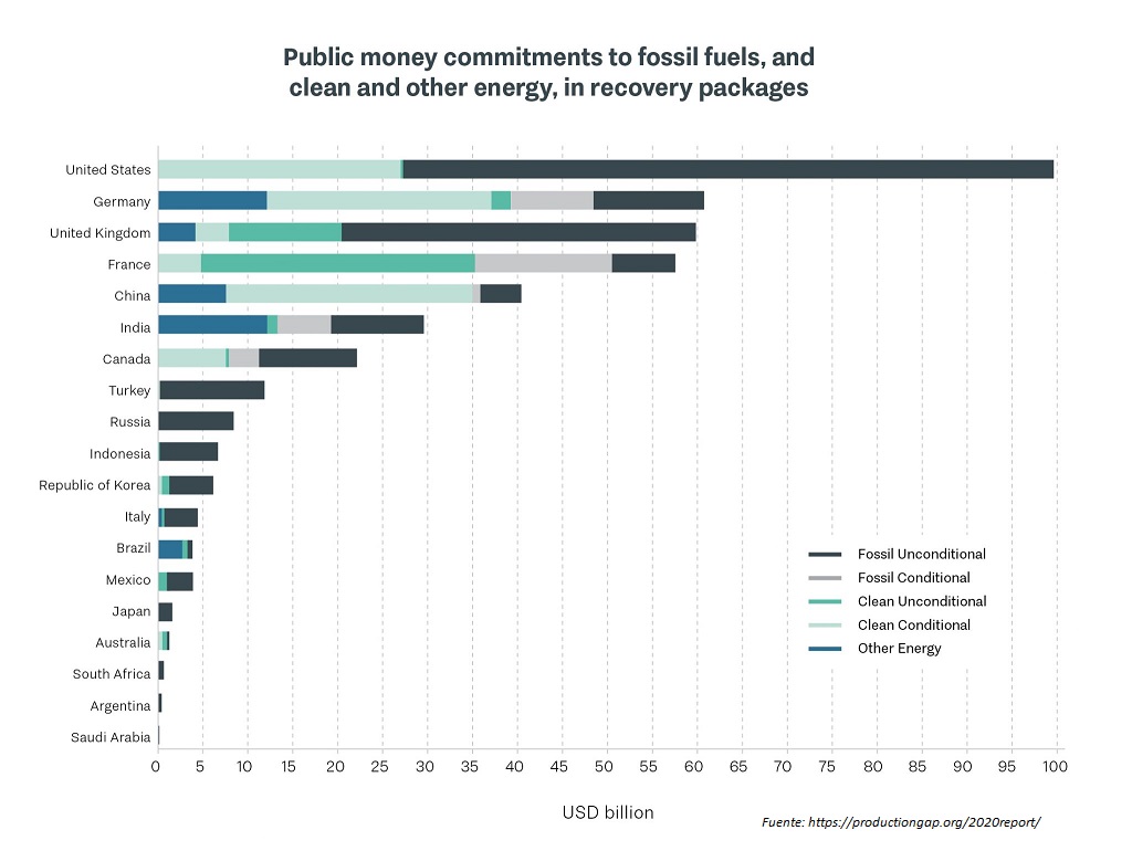 En la misma página web, se proporciona el siguiente gráfico que pone de manifiesto el apoyo a los combustibles fósiles por parte de los Gobiernos del mundo entero, entre los cuales se encuentran los de grandes potencias económicas, en los planes de recuperación del Covid-19: