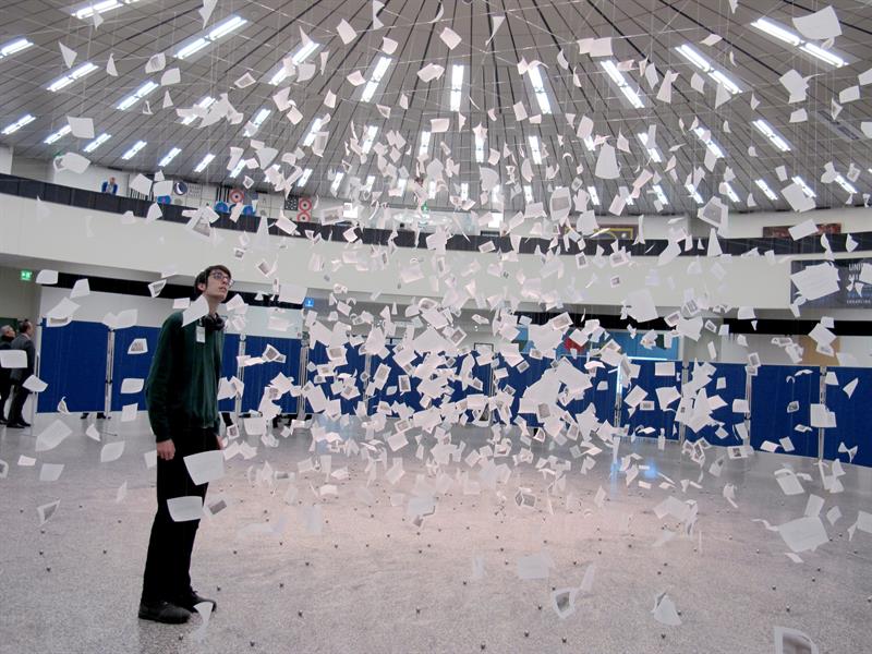 «La obra pretende poner los efectos de los desastres naturales sobre la mesa mientras se inaugura hoy la Conferencia de la ONU sobre el Cambio Climático en Bonn», explicó a Efe su autora, Raquel Lejtreger. El móvil, de más de cinco metros de altura y ocho de diámetro, está compuesto por más de 2.000 rectángulos de papel poliéster impreso, suspendidos en el aire.