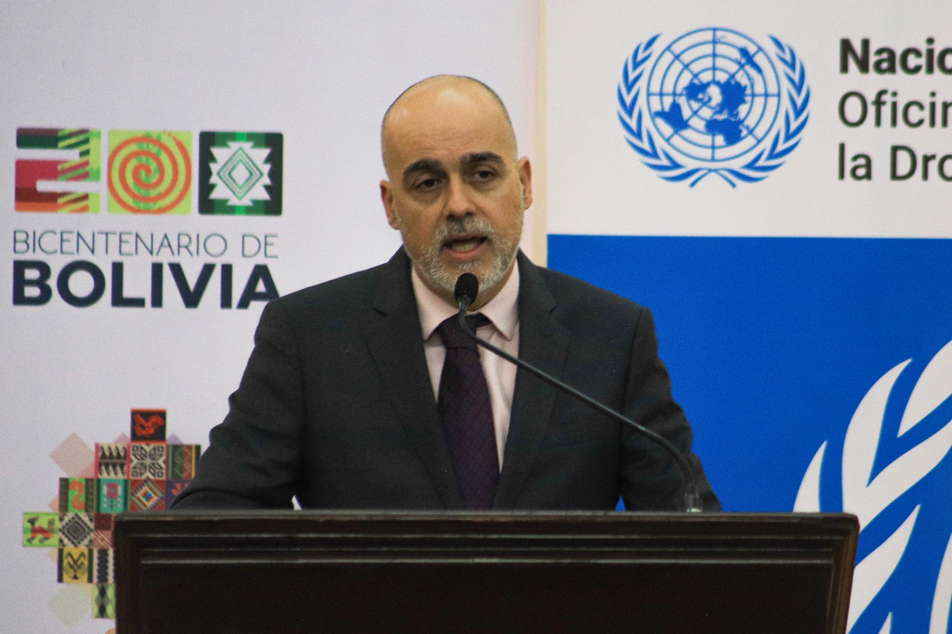 El embajador destacó que la UE cumple 30 años en Bolivia y que desde 2005 el bloque invirtió «más de 225 millones de euros en programas» de manejo sostenible de los cultivos de hojas de coca, la lucha contra el crimen organizado y el apoyo a la política nacional antidrogas.