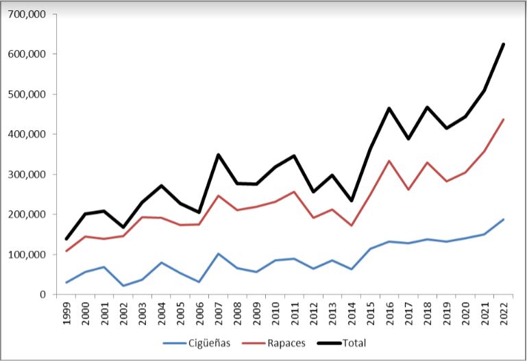 Según los datos de la Fundación, en el periodo 1999-2022 han contabilizado 11.962.460 de aves planeadoras, correspondientes a 4,1 millones de cigüeñas y 7,8 millones de aves de presa. Las aves planeadoras aprovechan las corrientes de aire cálido ascendentes para ganar altura y planear hasta el otro continente, pues no se forman en el mar.