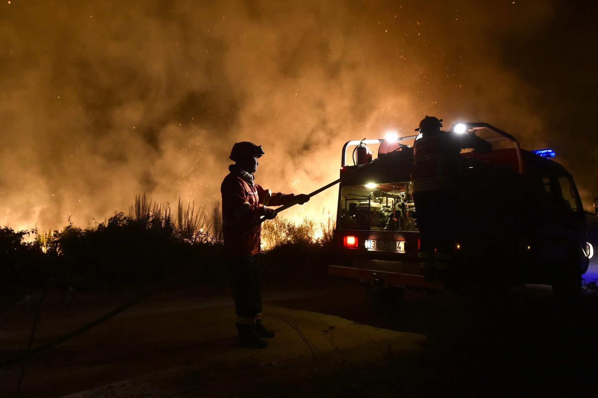 En total, 238 bomberos, apoyados por 84 vehículos terrestres, trabajan en las últimas horas para combatir el avance de las llamas en Viana do Castelo.