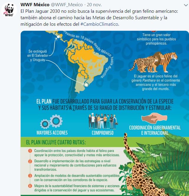 Con este plan, la responsable de WWF en México aseveró que se busca «encontrar colaboración entre los países» en los que habita el jaguar y «poder lograr una conservación integrada», lo que les permitirá a «aspirar a lograr llegar a las metas de desarrollo sostenible que se prometieron».
