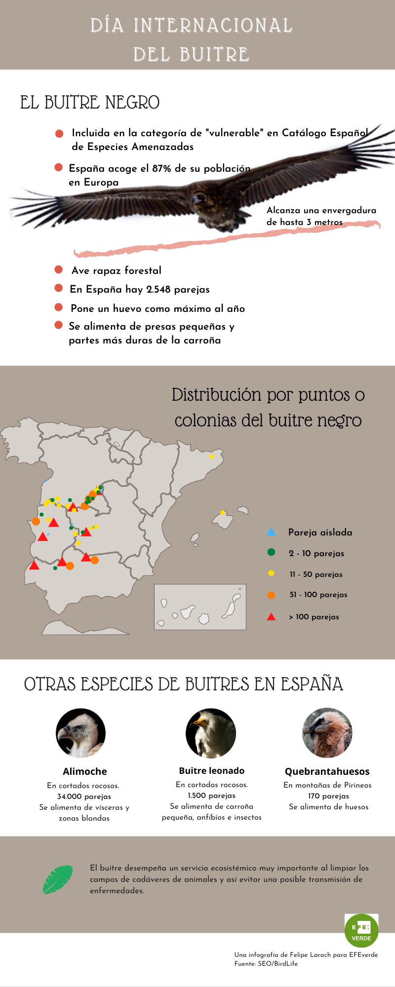 Con alrededor de 2.500 parejas distribuidas en 43 colonias, España cuenta con el 87% de la población europea de buitre negro, una presencia que años tras año «sigue creciendo y se encuentra en un estado favorable» ha explicado a EFEverde el coordinador de Ciencia Ciudadana de SEO/BirdLife, Juan Carlos del Moral, aunque insiste en que hay «que hacer muchos esfuerzos para que este estado no se revierta».