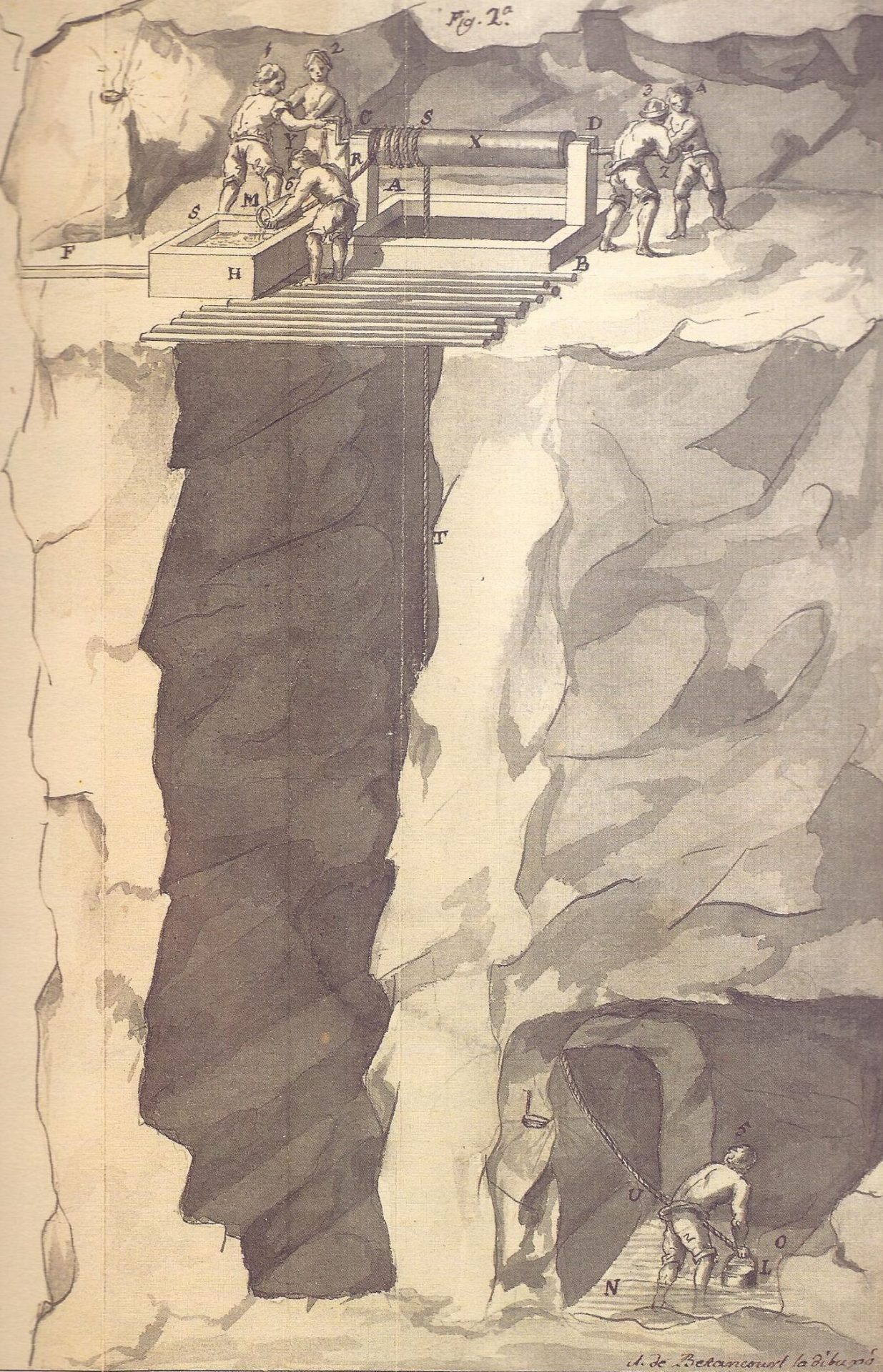 “Tres de setiembre de 1775 acompaño a mi amo el doctor Parés a registro de accidente de un forzado de mina. Entramos a la caña (galería) de la cárcel, se aya toda mamposteada. Andamos y andamos hasta la caja del torno de Castro. El torno de Castro es superficial, está a espaldas de la calle Nueva. Al llegar a su pie esta la caña de levante, de 40 varas orientada a ese rumbo y sin fruto alguno. Alcanzamos el torno de San Andrés y no paramos, seguimos por la caña de San Andrés a poniente otras 80 varas, 68 primeras mamposteadas y 12 en piedra firme y alcanzamos el socavón del Castillo de allí seguimos hasta la caña de red, mamposteada y orientada a poniente y después sale al norte la traviesa del torno grande, donde paramos. Hallense cinco personas, un tirador en el suelo, sangrando por la cabeza rota. Asístelo el doctor, yo miro a los otros tres tiradores puestos en cada cigüeña del torno. Ellos sujetaban el huso del torno cuando bajaban un madero por el torno,y el amaynador sujetaba el cintero (soga) que daba dos vueltas al huso del torno y que iba dejando caer poco a poco,.Dejaronle tomar demasiada velocidad y no pudiendole detener, abandonan los manubrios, salta el huso fuera de los estantes con la rapidez del movimiento y golpeó al forzado que no ha podido huir por la estrechez del terreno. Creo que yace muerto.