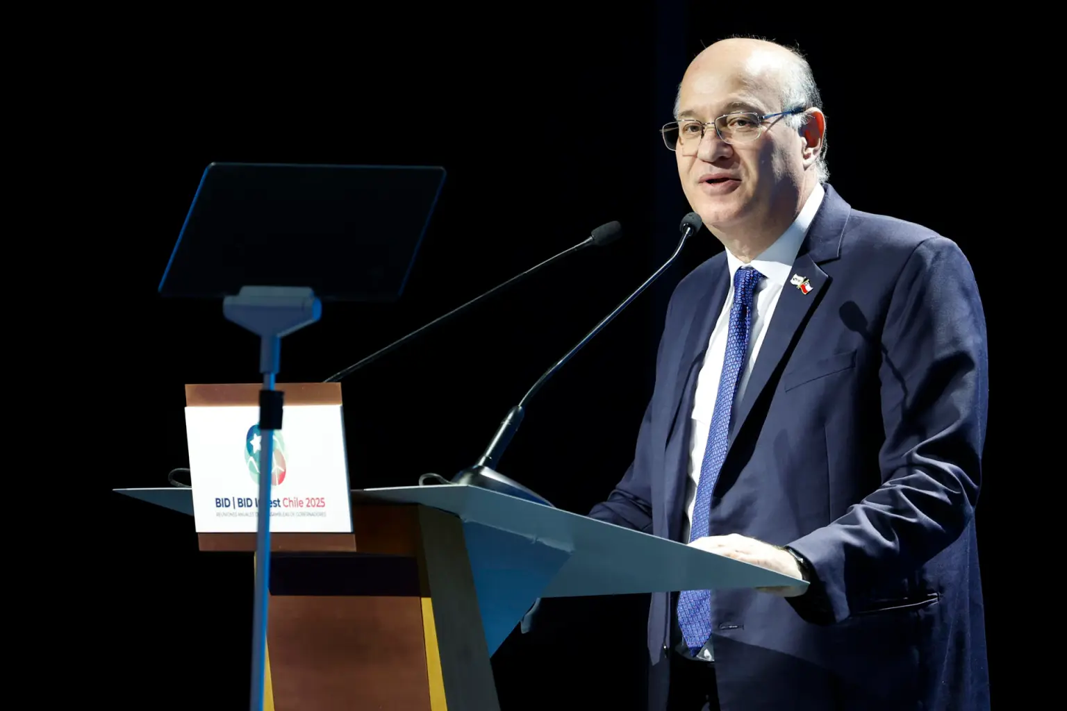 El presidente del Banco Interamericano de Desarrollo (BID), Ilan Goldfajn, habla durante la tercera jornada de las Asambleas Anuales de Gobernadores del BID y de BID Invest 2025 en Santiago (Chile).EFE/ Elvis González