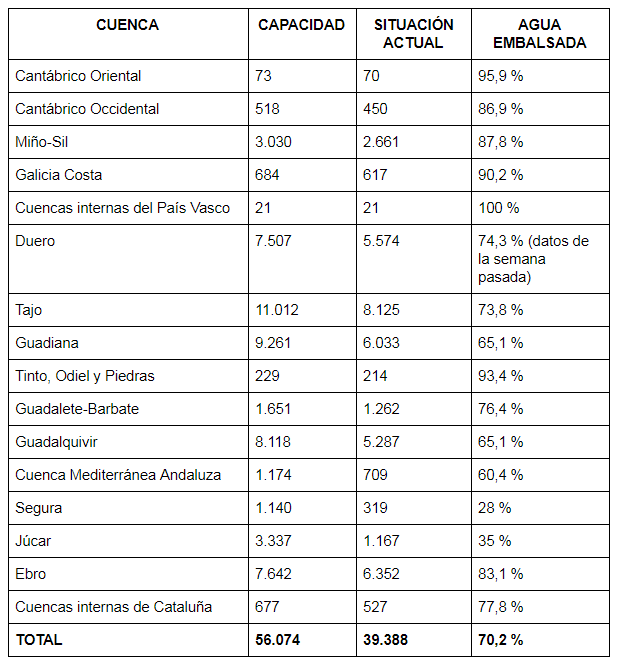 Todas las demás cuencas hidrográficas acumulan reservas muy por encima del 50 por ciento, y destacan las del Cantábrico Oriental (al 95,9 por ciento), Galicia Costa (90,2), las cuencas Internas del País Vasco (al 100 por cien); Tinto, Odiel y Piedras (al 93,4 por ciento), mientras que el Duero, el Tajo y las Cuencas Internas de Cataluña están por encima del 73 por ciento.