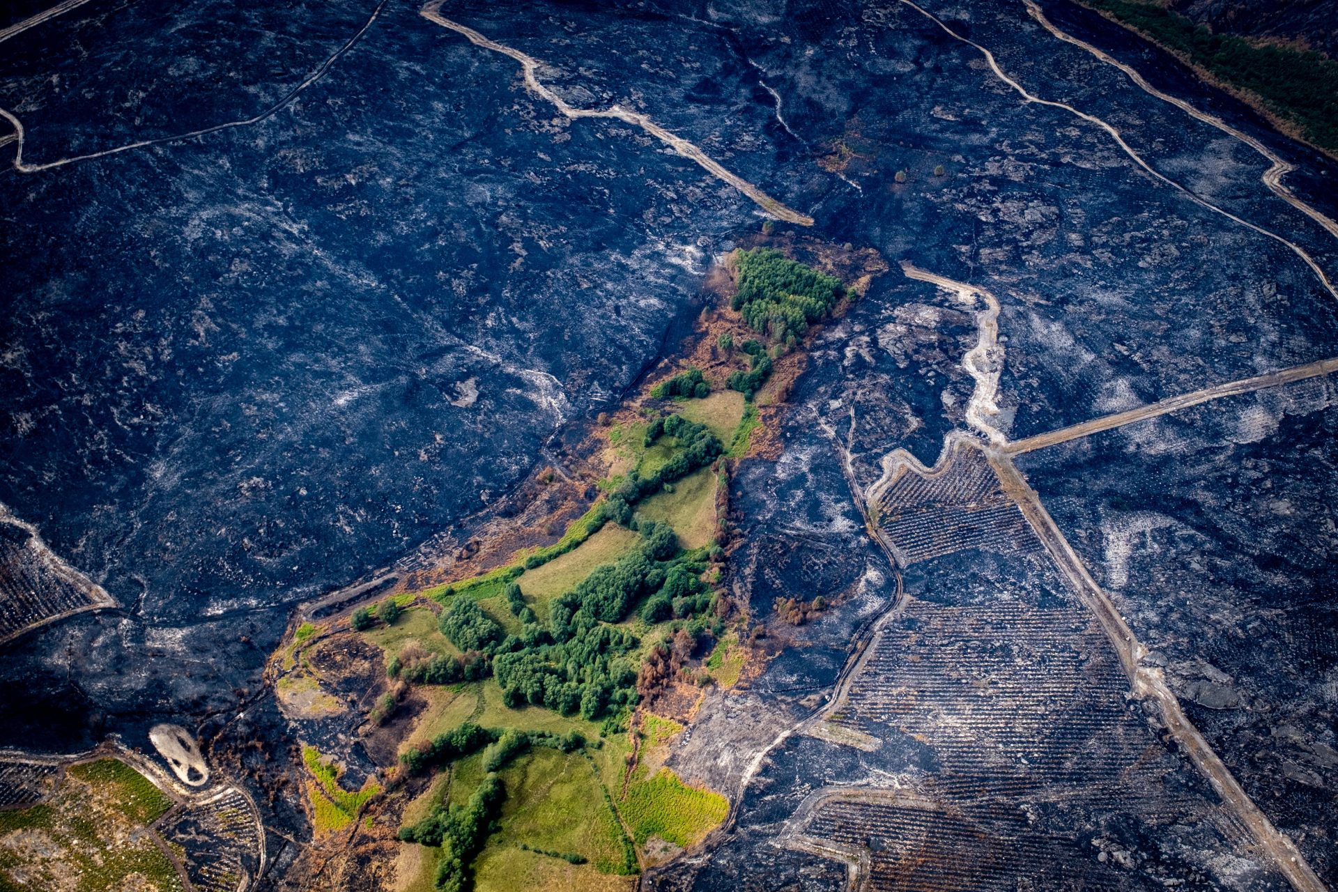 Las imágenes muestran retratos inéditos de suelos calcinados: casas con techos destruidos rodeadas de ceniza, espacios protegidos reducidos a manchas negras y antiguos santuarios ecológicos arrasados. Entre ellos, puntos que no habían sido fotografiados hasta ahora como la Serra do Courel, el Parque Natural de O Invernadeiro o la parroquia de Parafita, que hace parte de la Red Natura 2000.