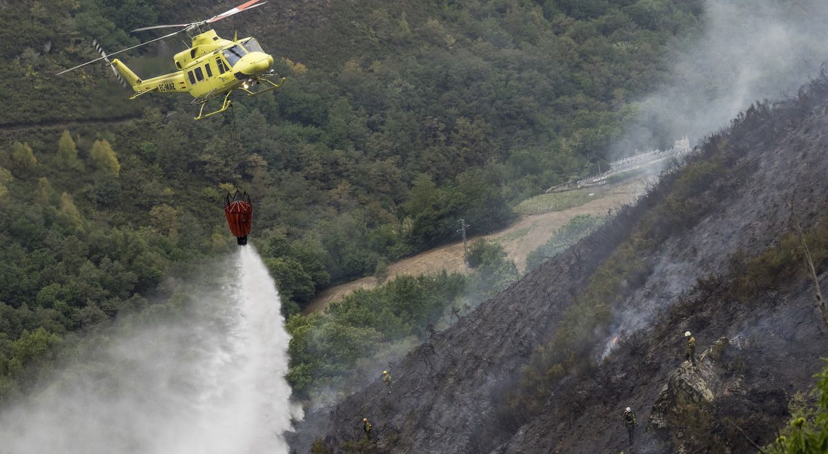 Trabajan en su extinción 1 técnico, 12 agentes, 50 brigadas, 21 motobombas, 4 palas, 13 helicópteros y 3 aviones. Efeverde