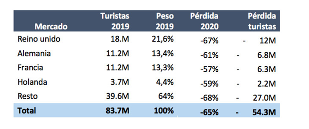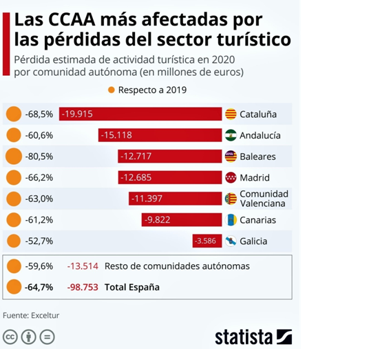 Las pérdidas económicas del sector turístico llegarán a 88.000 millones de euros, lo que supone el 6,2% del PIB nacional. Según Simon-Kucher, Baleares y Cataluña serán las comunidades autónomas más golpeadas porque el turismo caerá 76% y 66%, respectivamente.