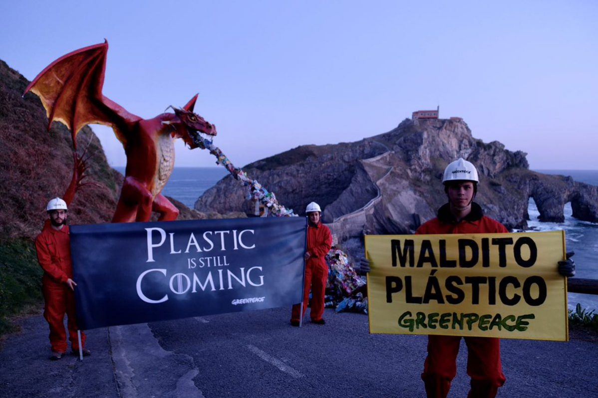 Haciendo un guiño a la popular serie, los activistas han desplegado una pancarta en la que se leía «Plastic is still coming» (el plástico todavía viene, en referencia al frase lema de la serie «Winter is coming», se acerca el invierno).