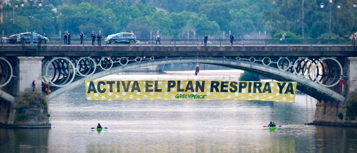 Además de esta pancarta en el ojo central del puente, y estampada en lunares como homenaje a la Feria de Abril que tampoco podrá celebrarse este año, dos kayaks con sendas pancartas lanzaban a primera hora otros mensajes dirigidos al alcalde: «Espadas, no seas malaje» y «RE_inventa Sevilla”.