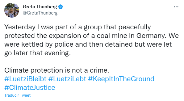Redacción Medioambiente.- «La protección del clima no es un delito», se ha justificado hoy la activista sueca Greta Thunberg en un tuit, después de ser desalojada ayer martes por la Policía en una acción de protesta en la zona de Lützerath en el estado federado de Renania-Palatinado (Alemania).