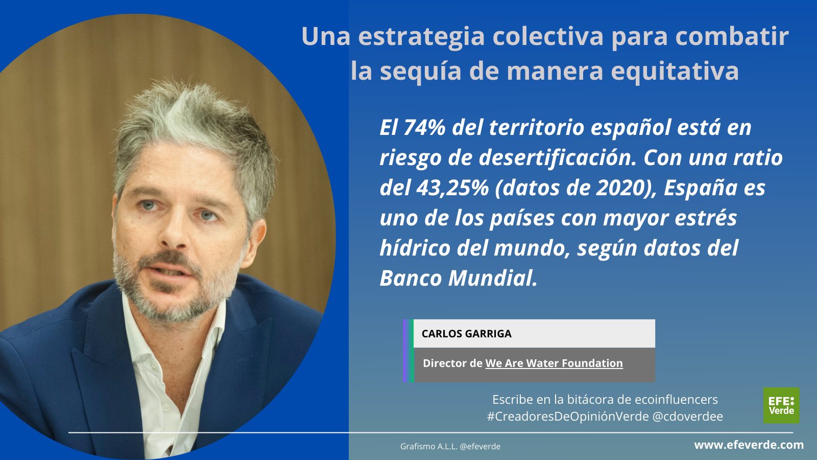 Madrid.- En víspera del Dia Mundial del Agua, EFEverde publica en la bitácora Creadores de Opinión Verde el artículo: Una estrategia colectiva para combatir la sequía de manera equitativa. Por (*) Carlos Garriga (We Are Water Foundation)