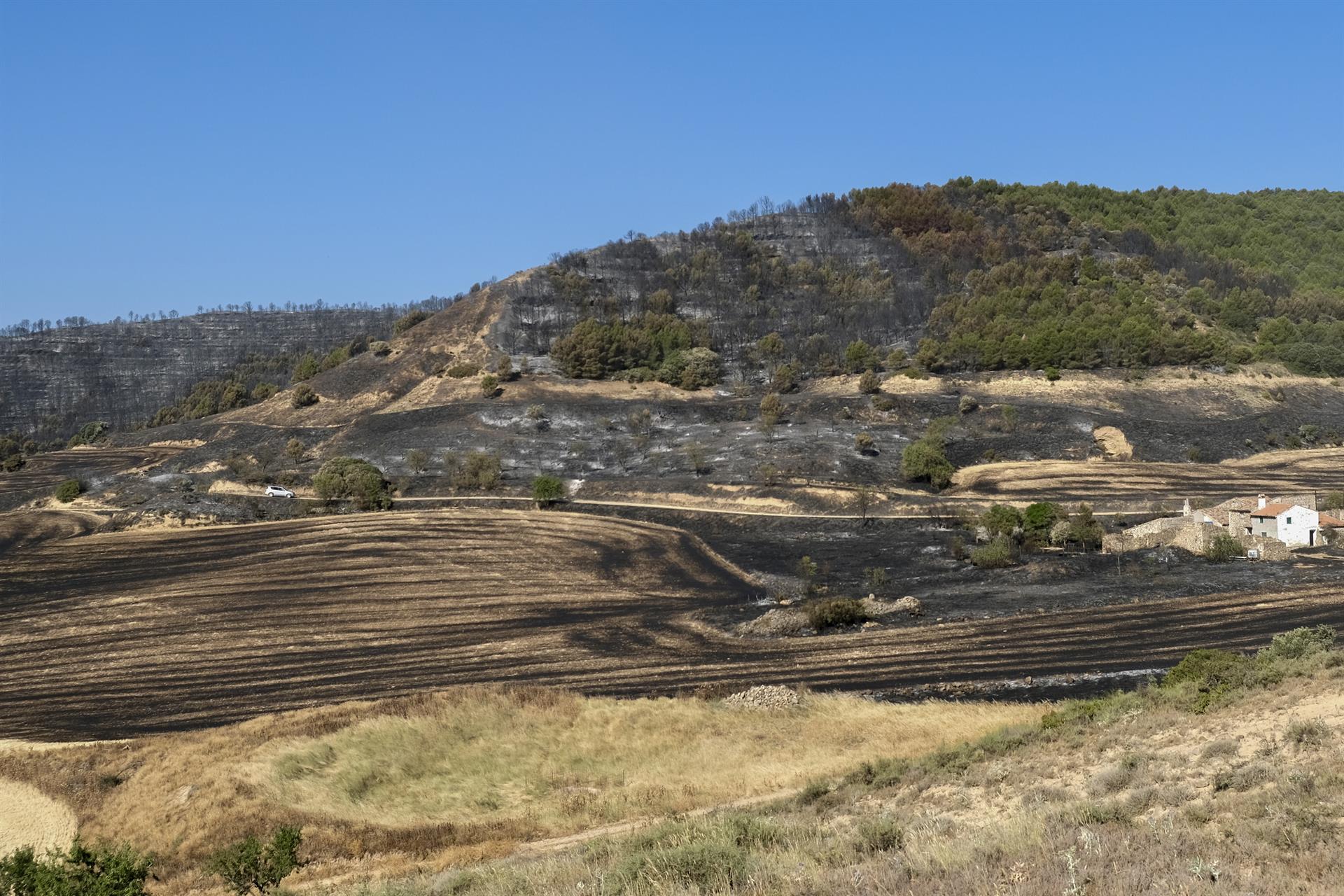 El fuego afecta a las faldas del monte Yerga, entre Alfaro y Grávalos, hasta donde se trasladaron ayer bomberos forestales, del CEIS, medios aéreos ubicados en la comunidad riojana, un hidroavión del ejército y helicópteros con base en Soria, hasta completar una dotación de cien personas trabajando en las labores de extinción.