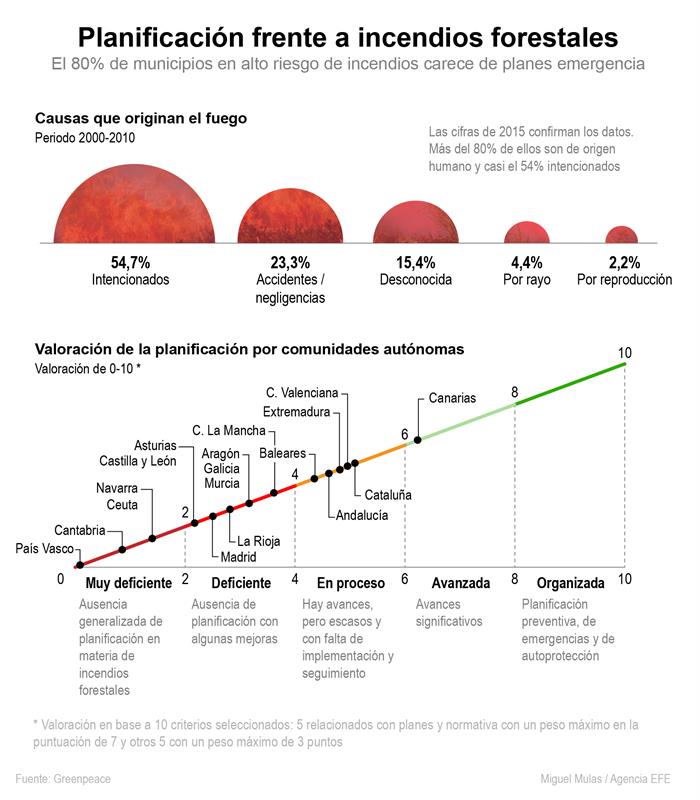 El documento analiza el estado de la planificación frente a incendios forestales en toda España y concluye que tan solo 5 de las 17 comunidades autónomas cuenta con «Planes de Prevención de Incendios Forestales» que, «aún así, no llegan al aprobado», según ha informado la responsable de la campaña de Incendios de Greenpeace, Mónica Parrilla.