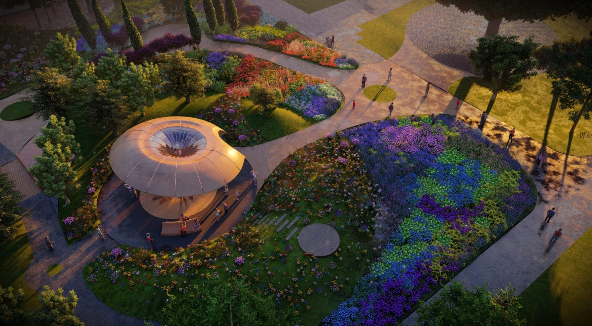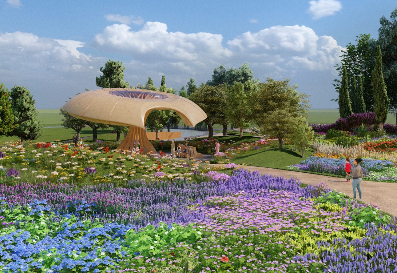 El pabellón central del jardín está diseñado por Mizzi Studio e inspirado en la relación simbiótica entre los reinos vegetal y fúngico. Creado a partir de materiales naturales y bajos en carbono, el espacio protegido apoyará las visitas escolares y las actividades comunitarias.