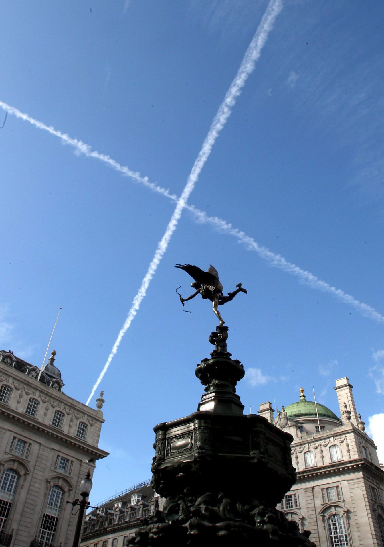 Estelas de aviones en la londinense plaza de Piccadilly Circus. Inglaterra. EFE/Andy Rain