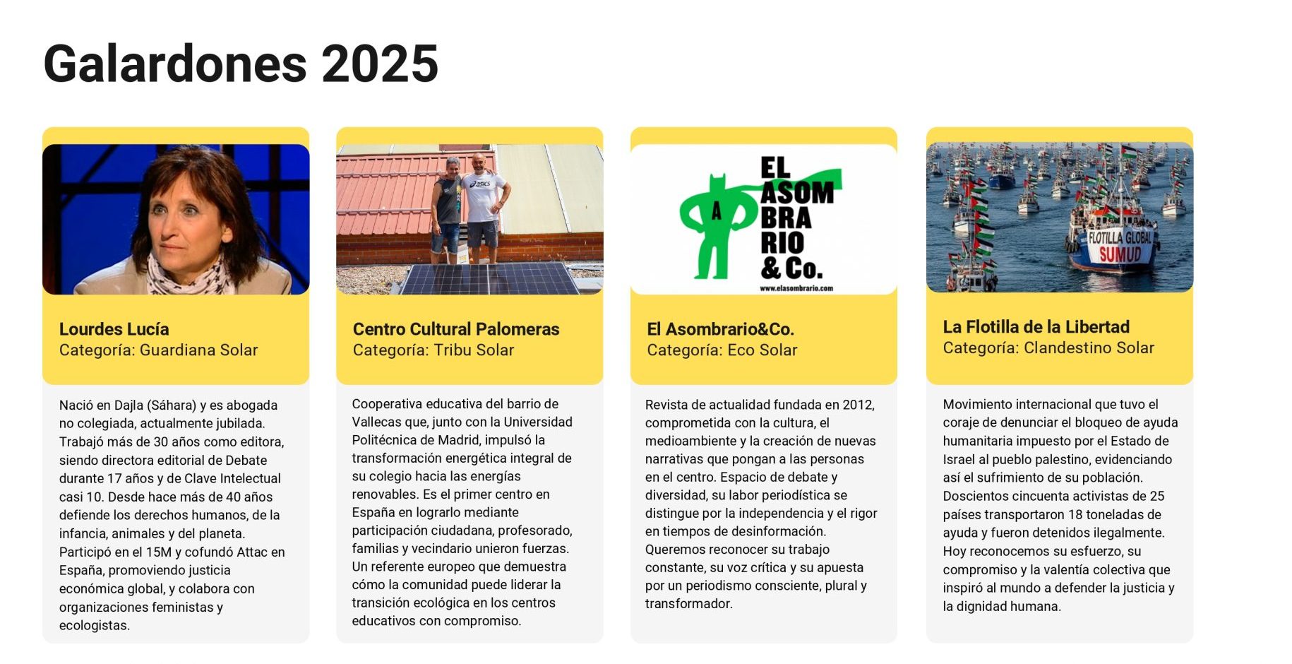 La categoría Guardiana Solar distingue a Lourdes Lucía, editora y activista que lleva más de cuatro décadas defendiendo los derechos humanos, la justicia social y ambiental.