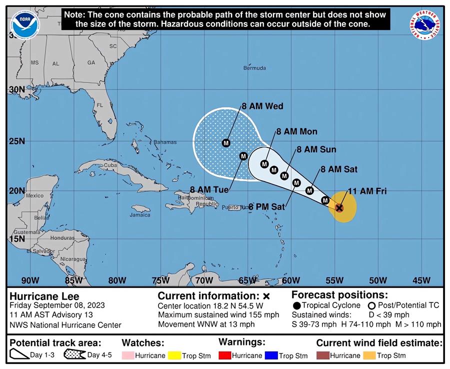 En la trayectoria pronosticada, detalla, se espera que Lee pase «bien al norte» de las Islas de Sotavento del norte, Islas Vírgenes y Puerto Rico durante este fin de semana y hasta las primeras horas de la próxima semana.