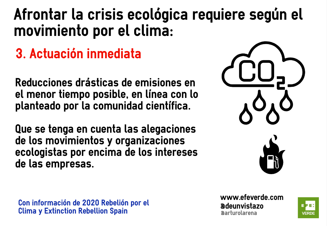 Las demandas de estos grupos se dirigen no solo al actual ejecutivo del PSOE sino a «todos los grupos políticos» e incluyen la declaración «efectiva» de emergencia climática y «que se diga la verdad a la ciudadanía respecto a la crítica situación climática y ecológica». Reclaman también la asunción de reducciones «drásticas» de emisiones teniendo en cuenta «las alegaciones de los movimientos y organizaciones ecologistas por encima de los intereses de las empresas» y la puesta en marcha de «instrumentos ciudadanos» para supervisar estas medidas, incluyendo «asambleas ciudadanas» asesoradas por expertos independientes .