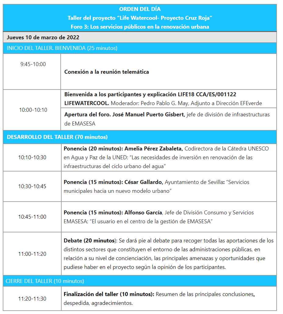 El foro arrancará con la intervención de José Manuel Puerto Gisbert, jefe de división de infraestructuras de Emasesa, que presentación el proyecto LIFE WATERCOOL LIFE 18 CCA/ES/001122.