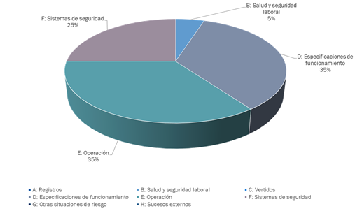 En la mayoría de los casos, las notificaciones de sucesos se debieron a criterios relacionados con la operación de la instalación (35 %) y a especificaciones técnicas de funcionamiento (35 %), seguidas de las actuaciones de sistemas de seguridad (25 %) y de las correspondientes a salud y seguridad laboral (5 %).