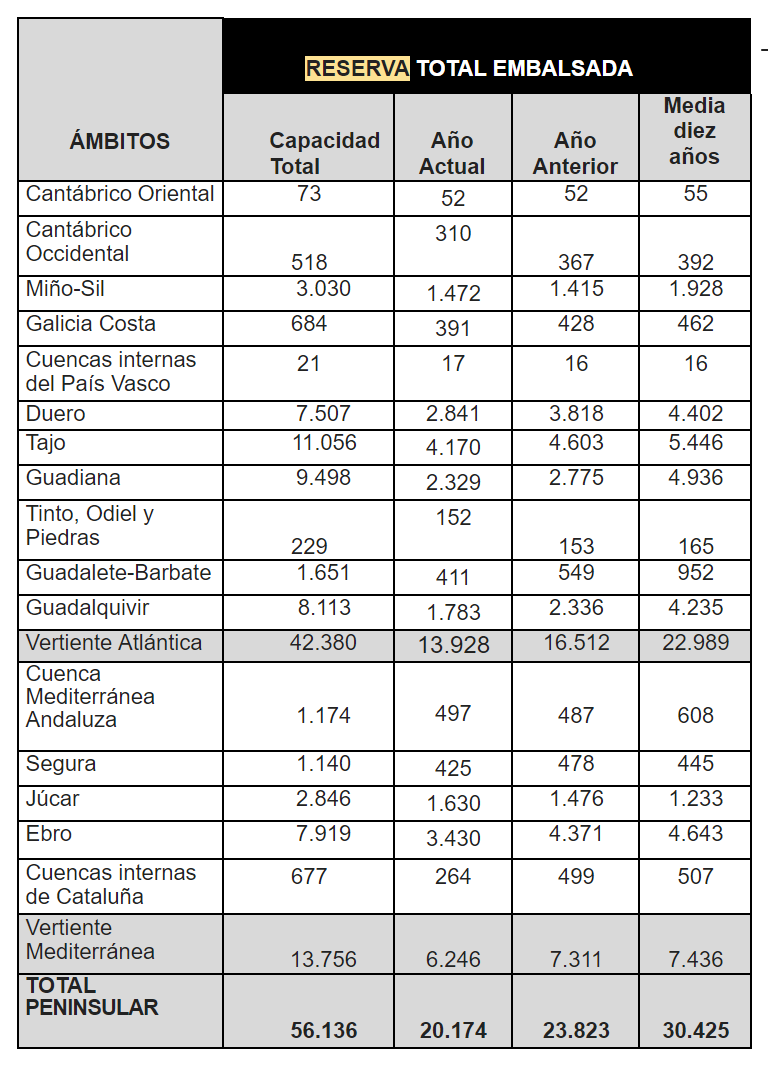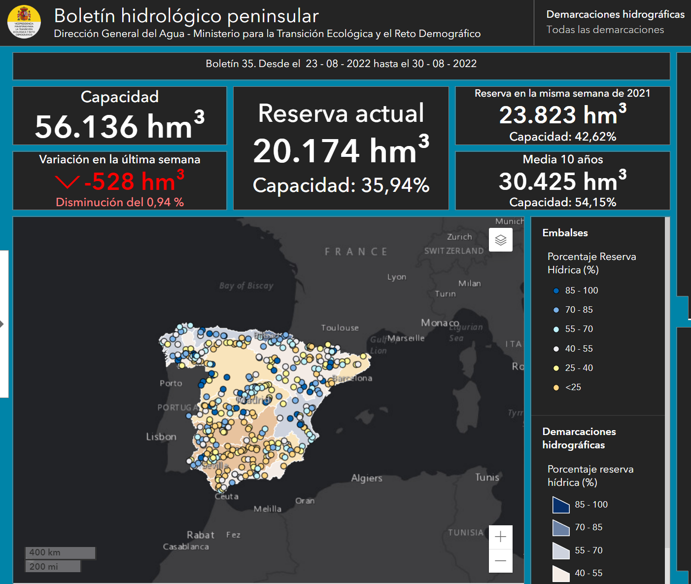 Tras un nuevo descenso, los embalses españoles se encuentran al 35,9 por ciento de su capacidad total, con 20.174 hectómetros cúbicos (hm³) de agua almacenados tras caer su volumen en la última semana en 528 hectómetros cúbicos (el 0,9 por ciento de la capacidad total).