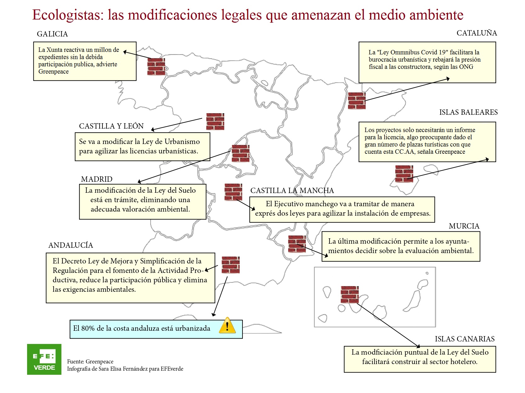 Las organizaciones conservacionistas WWF, Greenpeace y Ecologistas en Acción critican que tras la crisis del Covid-19 estos cambios efectuados en al menos nueve CC.AA -Cataluña, Islas Baleares, Islas Canarias, Andalucía, Murcia, Castilla y León, Castilla La Mancha, Madrid y Galicia- agilicen proyectos urbanísticos sin tener suficientemente en cuenta los criterios ambientales.