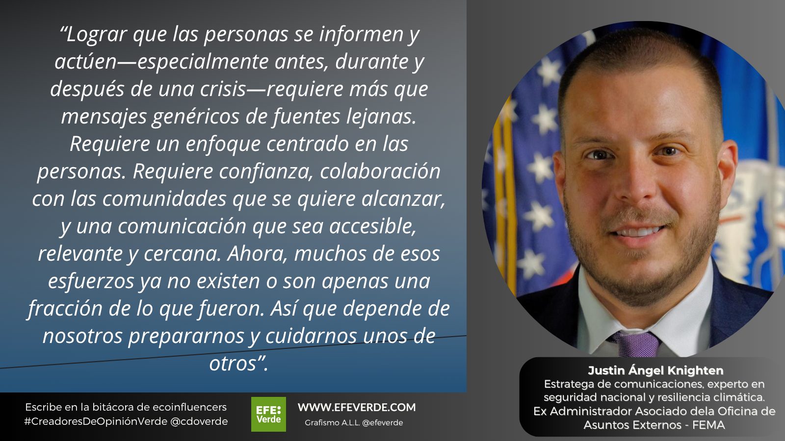 Lograr que las personas se informen y actúen—especialmente antes, durante y después de una crisis—requiere más que mensajes genéricos de fuentes lejanas. Requiere un enfoque centrado en las personas. Requiere confianza, colaboración con las comunidades que se quiere alcanzar, y una comunicación que sea accesible, relevante y cercana. Ahora, muchos de esos esfuerzos ya no existen o son apenas una fracción de lo que fueron. Así que depende de nosotros prepararnos y cuidarnos unos de otros. Esto siempre ha sido cierto para ayudar durante una crisis, pero es especialmente cierto ahora frente a los eventos catastróficos que ocurrirán este año.