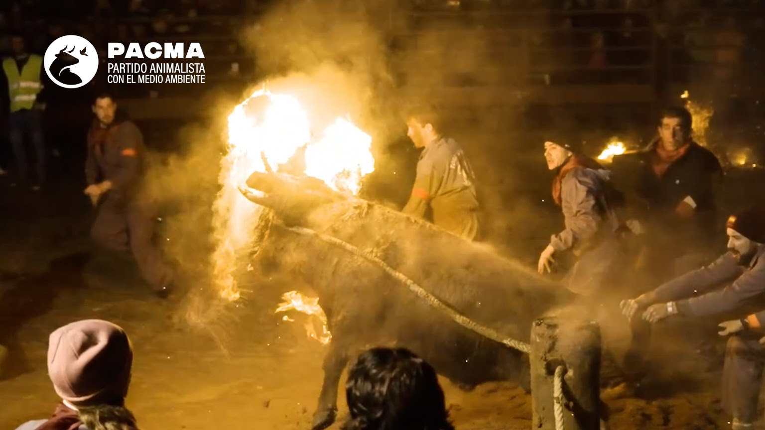 Una vez encendido, el toro llegó a zafarse parcialmente del pilón e intentó apagar las llamas hundiendo la cabeza en el barro. El partido califica la escena como un ejemplo evidente del estrés y la agonía a la que el animal fue sometido.
