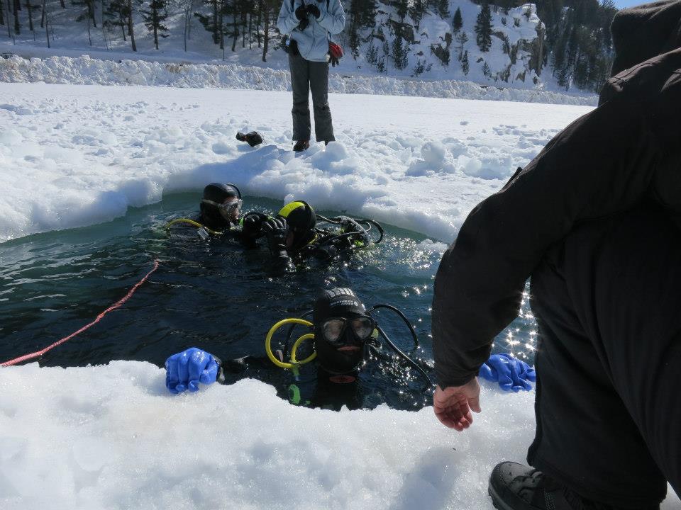 La inmersión bajo el hielo requiere una serie de materiales especiales para garantizar la seguridad de los buceadores, como los trajes secos (que emplean aire a presión para evitar la filtración de agua, habitual en los normales) o los reguladores especialmente preparados para temperaturas frías, a fin de evitar su congelación y por tanto la interrupción del suministro de aire.