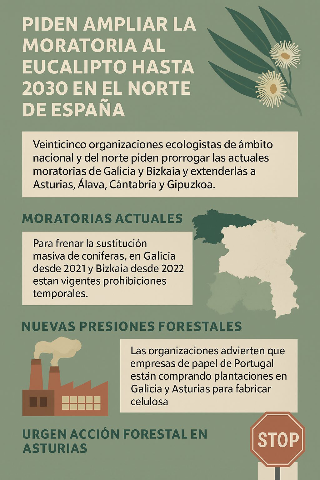 Como respuesta a este problema, las administraciones forestales respectivas establecieron prohibiciones temporales (en Galicia, desde 2021 hasta finales de 2025, y en Bizkaia, desde 2022 hasta finales de 2025) para intentar atajar la sustitución masiva de coníferas por eucaliptos.