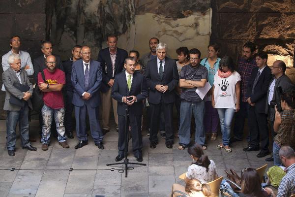 Rivero compareció en rueda de prensa acompañado de los miembros del Gobierno de Canarias (formado por Coalición Canaria y el PSOE) y por representantes de instituciones locales, partidos políticos y colectivos ciudadanos que están en contra de las prospecciones, respaldadas por el PP.