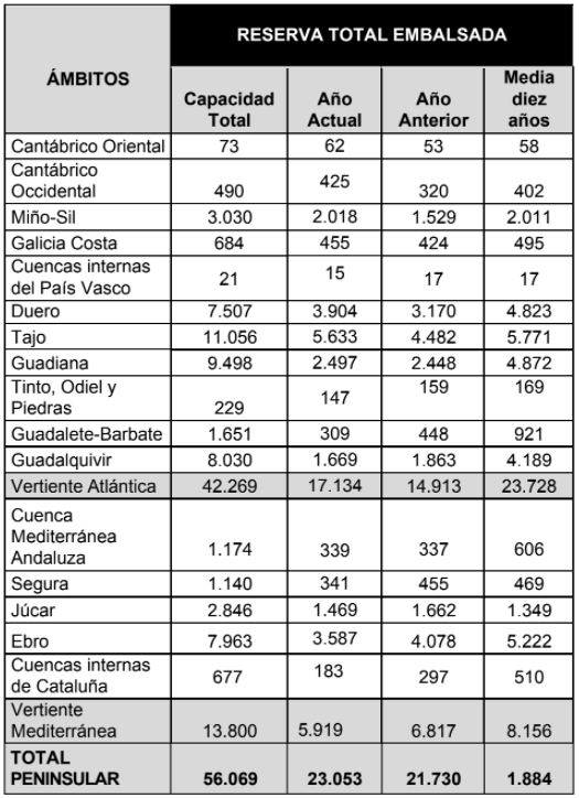La cantidad de agua embalsada a estas alturas del año es similar a la del 2022 por estas fechas (21.730 hm³), pero está muy por debajo de la media de los últimos diez años para esta misma semana (31.884 hm³).