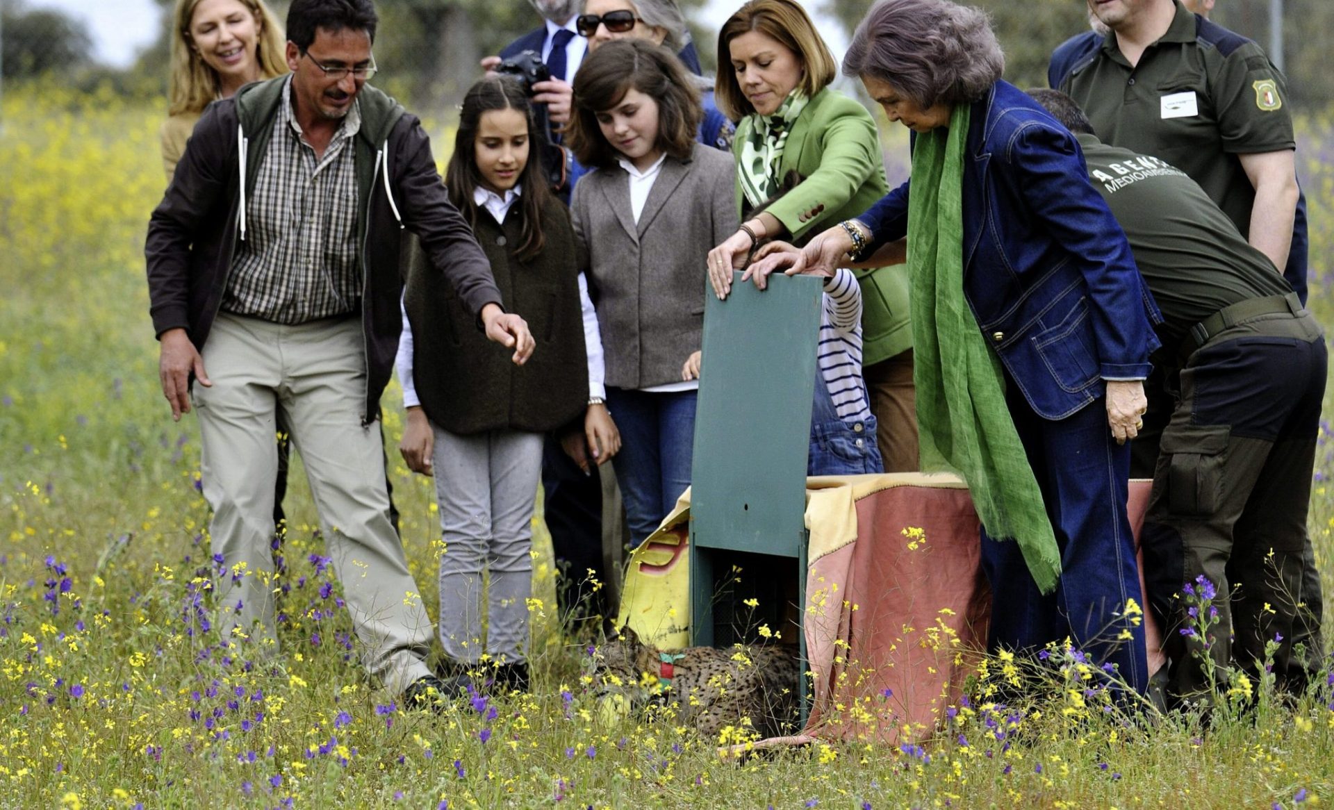 La Reina Sofía y la presidenta de Castilla-La Mancha, María Dolores de Cospedal, (c), participan en la suelta de dos linces del programa Iberlince, hoy en Mazarambroz, provincia de Toledo. EFE/Ismael Herrero