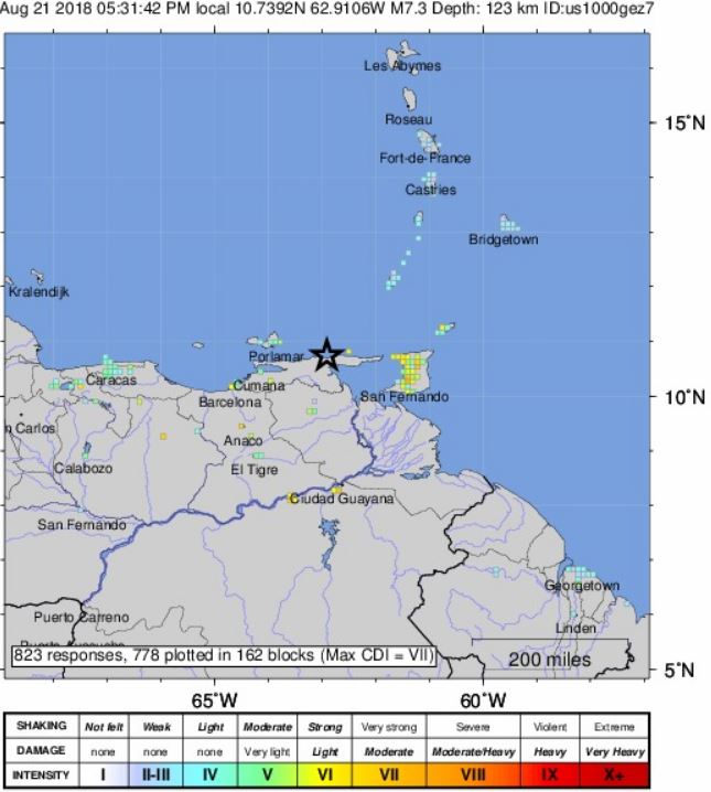 El sismo fue magnitud 6,9 con epicentro en el sureste de Yaguaraparo en el oriente de Venezuela, de acuerdo con la Fundación Venezolana de Investigaciones Sismológicas (Funvisis), mientras el Servicio Geológico de EE.UU. (USGS) reporta una magnitud de 7,3 y una profundidad de 123,2 kilómetros.